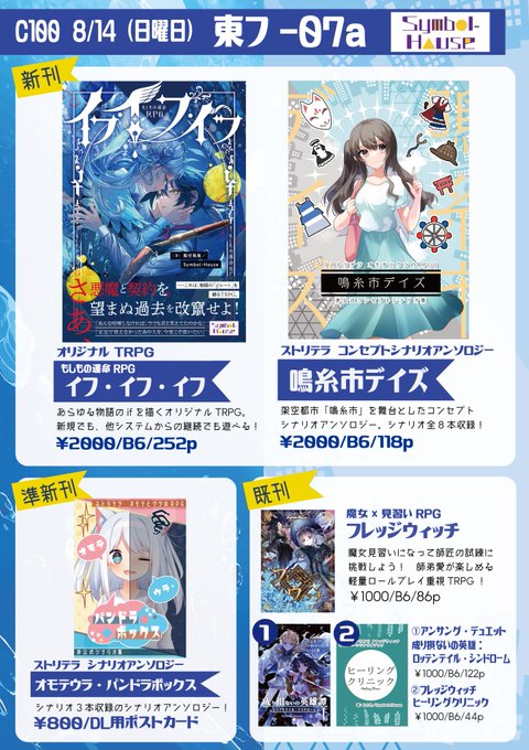 ■#C100 Symbol-Houseお品書き■ 8/14【東フ07a】 新刊 ・もしもの運命RPG『イフ・イフ・イフ』 ・ストリテラ『鳴糸市デイズ』 準新刊 ・ストリテラ『オモテウラ・パンドラボックス』DLカード 通販・電子書籍ありますので、ご無理ないようお気をつけてお越し下さい! #TRPG #ストリテラ #イフイフイフ