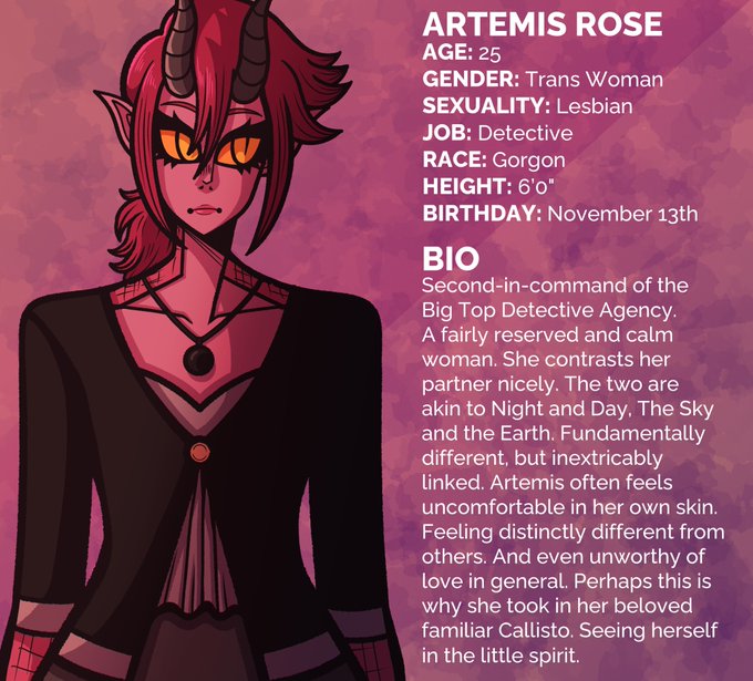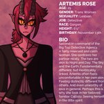 Bio and Model Sheet for Artemis. #OC #characterdesign #characterart #originalart #digitalart #animeart
