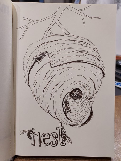 #inktober2022 #nest I thought about trying to sketch one of the birdhouse baskets my mom used to make, but I settled on paper #wasps. They do such an amazing job building their nests with spit & hard work. #ink #pdxartist #Artist #artistontwittter