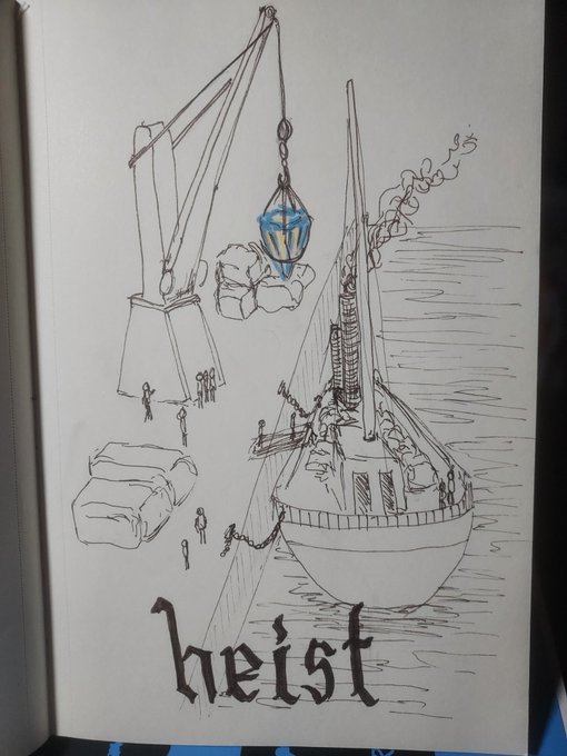 #inktober2022 #heist The word heist comes from a pronunciation of hoist, so I thought of a crane hoisting a huge gem out of an old school cargo ship. I don't think I did my vision justice, but here it is. #ink #pdxartist #Artist #artistontwitter