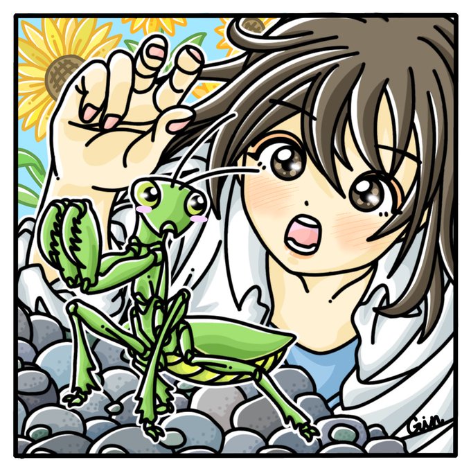 歩いていると石の上に、手の平よりも大きなカマキリがいました。 カマキリを見たのも久しぶりな上に、あまりにも衝撃的なサイズだったので、すぐにイラストにしようと思って描いてみました♪ #イラスト #絵師さんと繋がりたい #絵描きさんと繋がりたい #絵師 #女の子イラスト #アート拡散