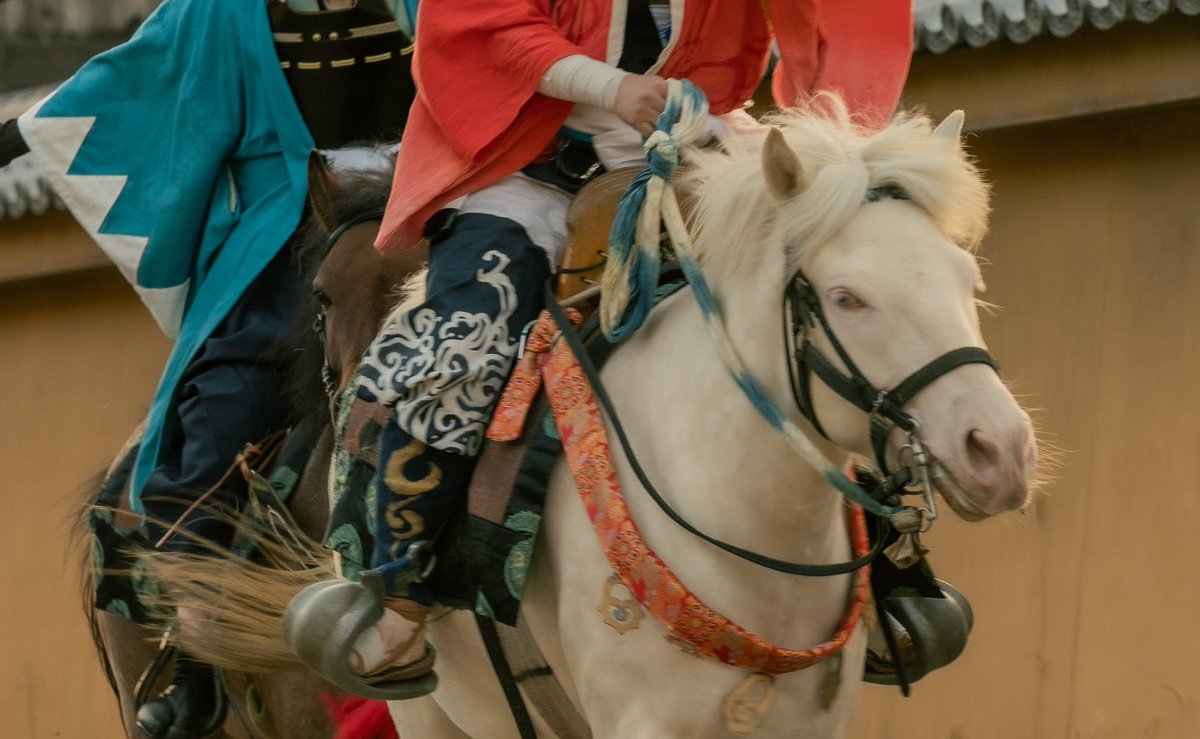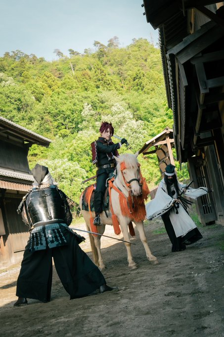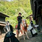 今日の速報 馬に乗って遡行軍と戦う刀剣男士が撮影できる機会いただけでありがとうございました🙏 大包平:由茄さん 敵太刀:柏さん 敵薙刀:みのZさん #コスプレ乗馬会in彦根オープンセット2022