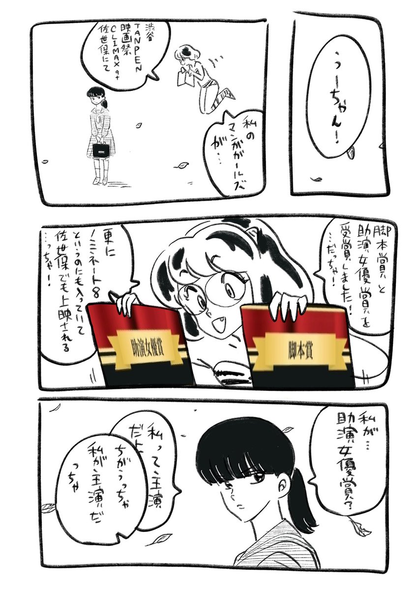 渋谷TANPEN映画祭CLIMAXat佐世保にて、作画しました『マンガガールズ』が、脚本賞と出演してくださった藤原 希さんが助演女優賞を受賞しました! 更にノミネート8というのにも残ったので、最終審査の佐世保行きが決まりました! #うる星やつら #indie_anime #絵描きさんと繋がりたい