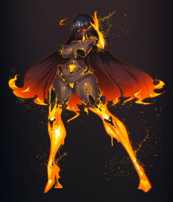 skeb納品させていただきました!ご依頼者様のオリジナルキャラクターさんです。身体からマグマを出し鎧の様に纏うとの事だったのでマグマの光が映えるような色合いを模索してみました! #skeb #commission