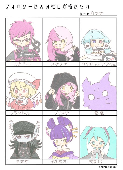 2 7 #フォロワーさんの推しが描きたい リプしてくださった方ありがとうございました!(ちなみに下段3つは枠が余ったので自分の好きなキャラ描きました。) 19/07/08 16:38