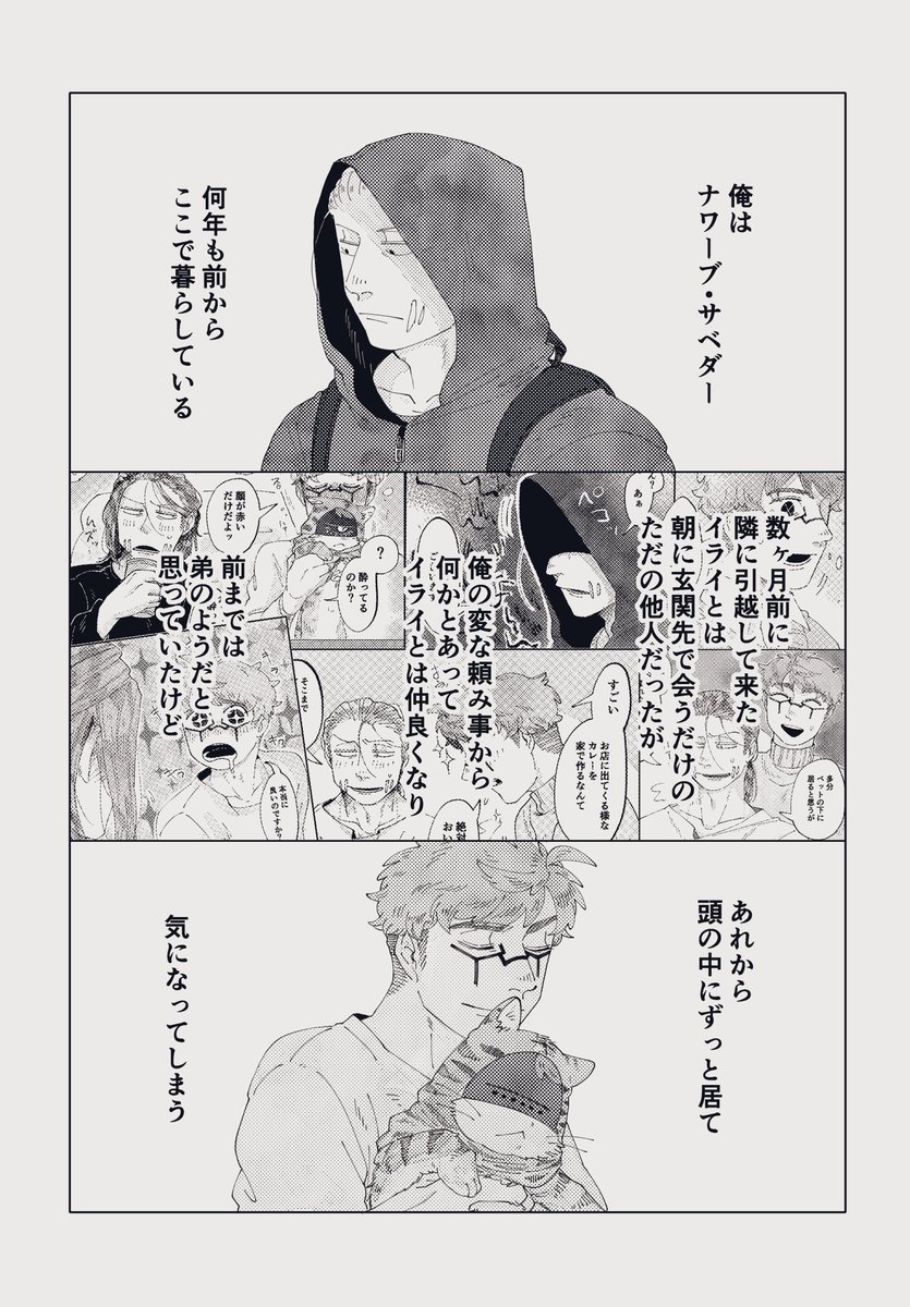 6/25 JUNE BRIDE FES.2023 傭占オンリー【フードの中を見せて】にて出す予定の新刊サンプルです!(1/3) 「俺は隣人のコトが少しだけ気になる」 現パロ傭占 P38/¥600(予定)/前回話有/全年齢 まだ脱稿できていないのですが必ず出したい…!よろしくお願いします🙇♀️