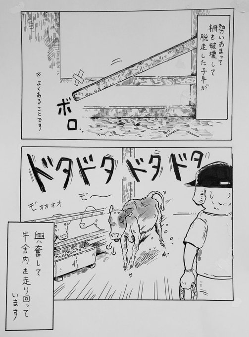 興奮子牛とパニック子牛🐮 ただの雑な絵日記です。 雑すぎたのでモノクロです。