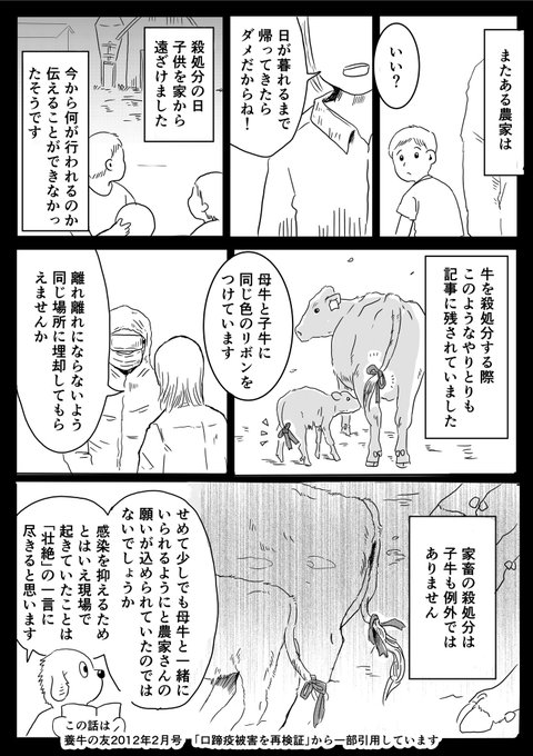 『口蹄疫について』(1/3) 今月、韓国で口蹄疫が発生したことを受けて 2010年の宮崎県口蹄疫について勉強会で聞いた話や読んだ記録をもとに少し描いてみました。 不十分な箇所が多いですが大目に見ていただけるとありがたいです ⚠️殺処分についても描いているので苦手な方は注意してください⚠️