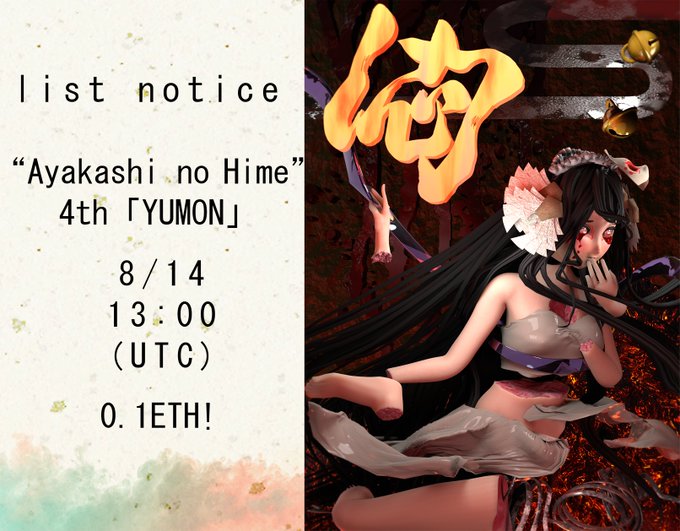 8 14 list notice🔥 I will list the 『YUMON』 that new work of TENSO-KITAN collection! :D 🔴8/14 13:00(UTC) 22:00(JST) 🔴0.1EHT 🔴Offers are accepted from 0.12 ETH🔥 opensea.io/assets/ethereu… #opensea #NFTartists #NFTjapan #3dcg #japanese 22/08/13 23:13