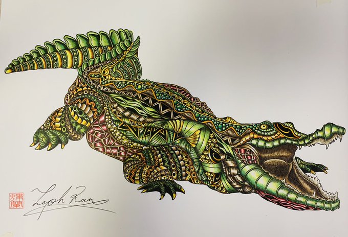 迷彩ワニ🐊😆 ペン:コピックチャオ、コピックマルチライナー サイズ:B3 #ワニ #迷彩 #コピック #コピックチャオ #copic #copicart #zentangle #doodle #penart #ゼンタングル #crocodile #alligator #illust #camouflage