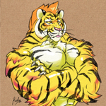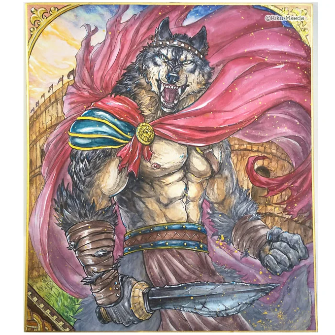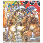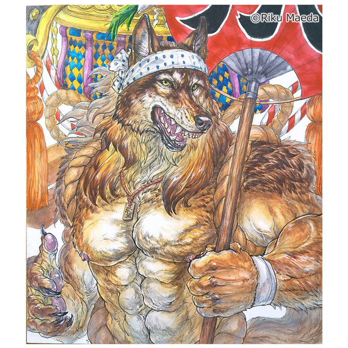 🐺「夏祭り ”祭狼”」 夏祭りシリーズから神輿担ぎの祭事狼を描きました。力自慢の若人のイメージです。神輿の上で音頭を取ったり大団扇で神輿を扇いだり、色々な役割があるそうです。 バックには銀を塗って神事の品性をイメージしつつ、金のしぶきで華やかに仕上げました。 twitter.com/TERRA_rikum/st…