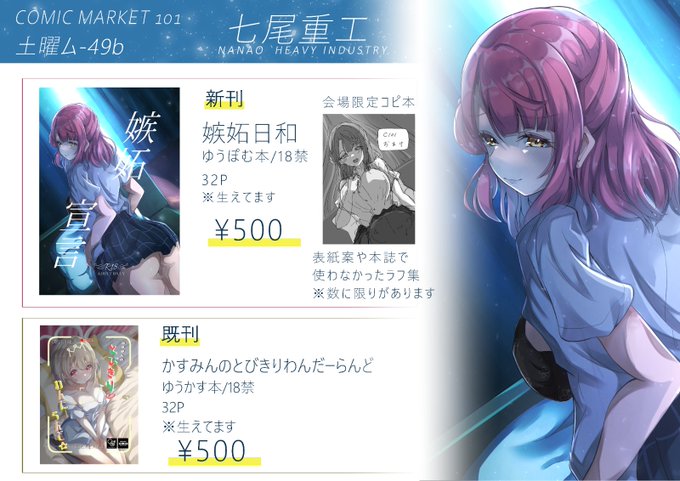 C101スペース頂きました! ゆうぽむ生えてる本になります! 原稿頑張ります!!!👍 あなたのサークル「七尾重工」は、コミックマーケット101で「土曜日東地区 "ム " 49b」に配置されました!コミケWebカタログにてスペース配置場所公開中です! webcatalog.circle.ms/Circle/Map/168… #C101WebCatalog