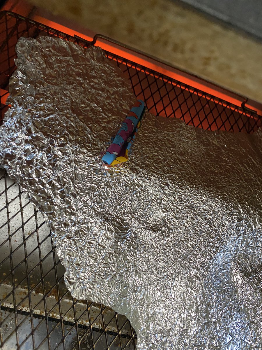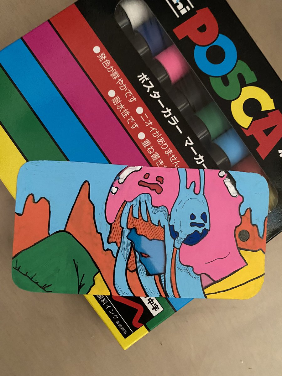 #イラスト #プラ板 イラスト描き終わったからレンチンしたら、丸まってくっついたんやが... 10分ぐらい奮闘したけど、諦めてそんままプレスしたわ...w おそらく、ポスカが縮みきらなかったんかな?