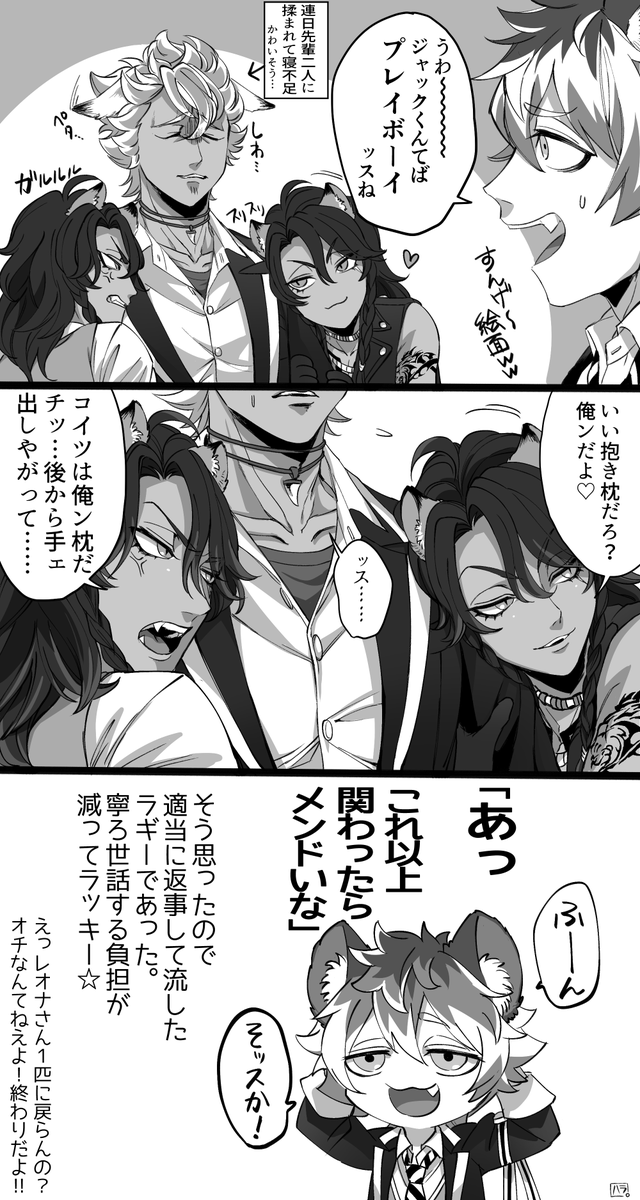 761 5312 2匹になった🦁先輩が🐺君を巡ってキャットファイトする感じのジャクレオでレオレオなトンデモおバカ漫画です。 どうしてこうなったのか自分でも分からんし微妙にハレンチなので色々注意してください。 #twst_BL 20/07/10 03:58