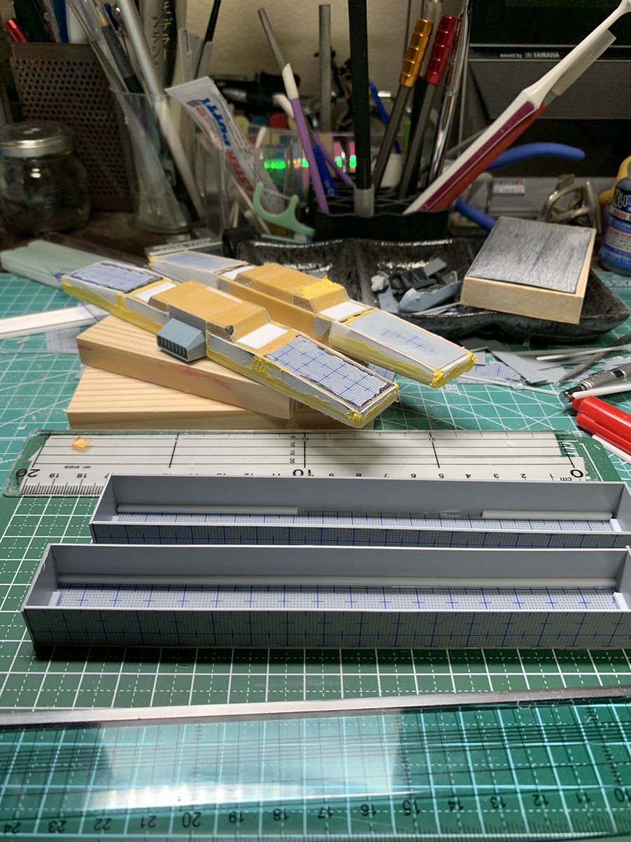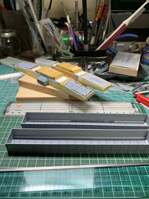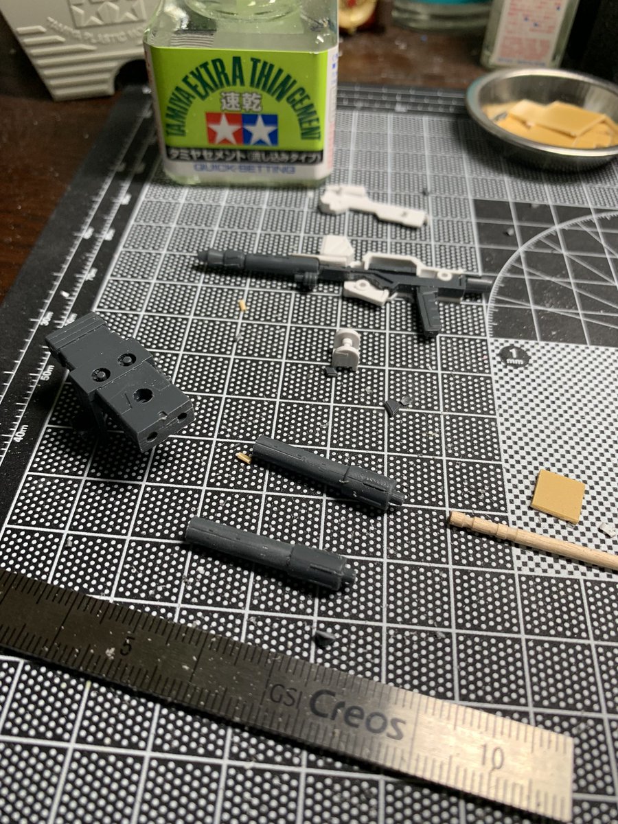 #ガンプラの画像を貼るとRTされると聞いて #ガンプラはどんな自由な発想で作ってもいいんだ #ザゥートヘヴィ改造 パテ盛って形状整えてプラ板切り出して箱に組んで〜。 …だいぶ上手くなったかな?プラ板で箱作り…