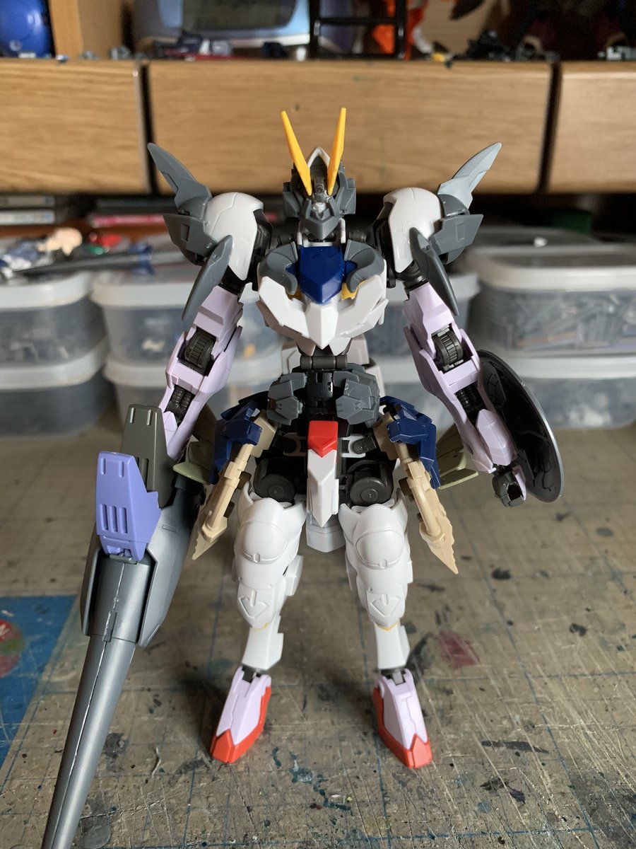 #ガンプラ 以前からの作りかけ、久しぶりに手をいれてます。 肩シールドの位置を変更してキャノン部にパーツを追加。
