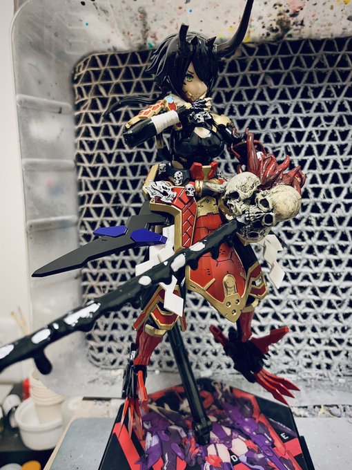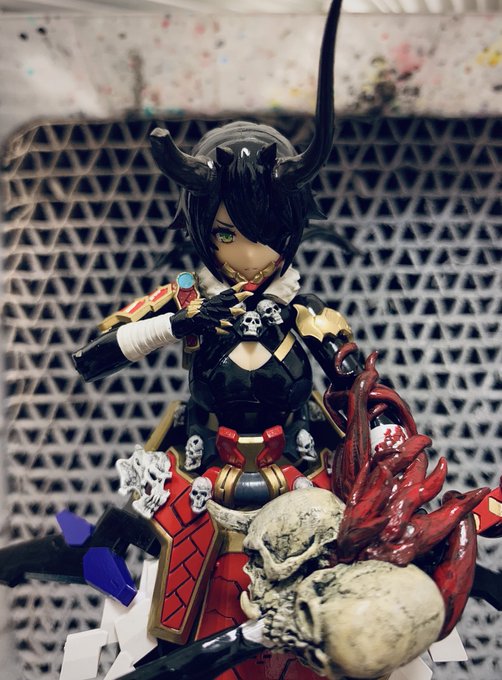 袴を赤色メインで派手目に行くので上半身はシックなブラックで! 今更ながら角を赤で塗り直すか思案中 #メガミデバイス