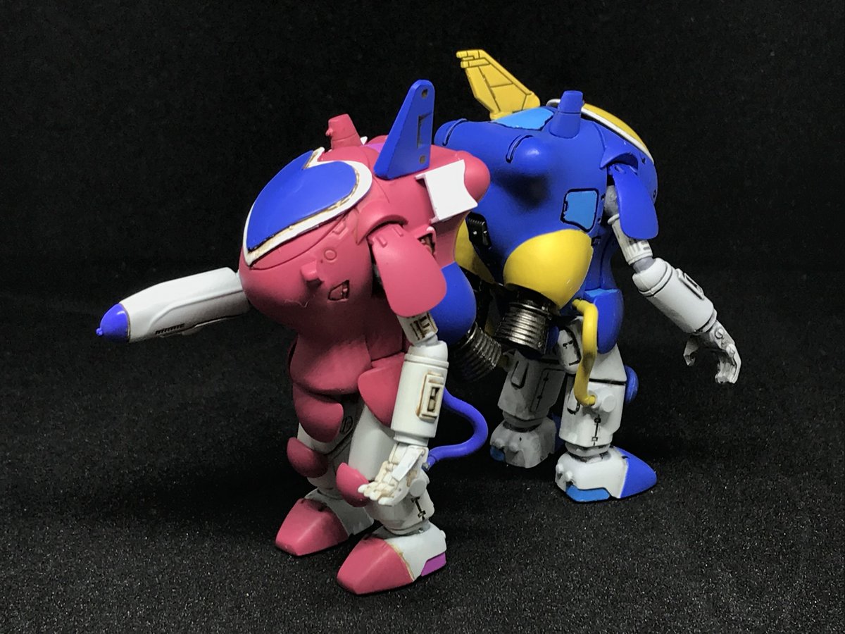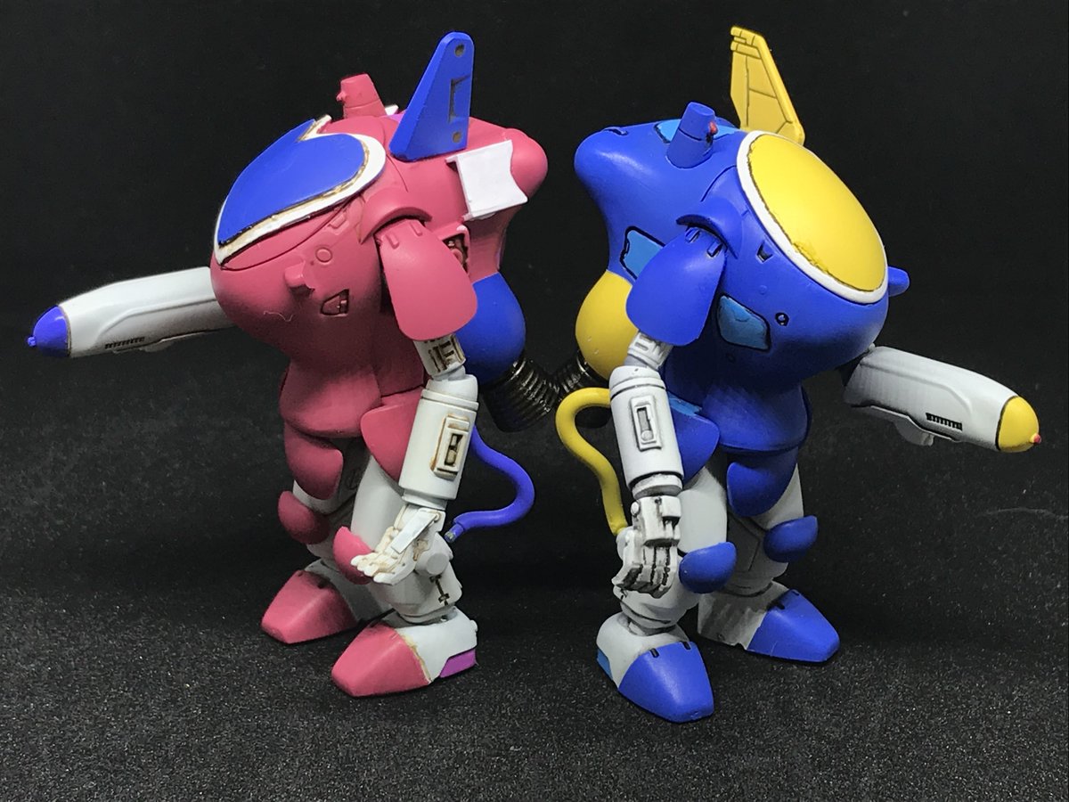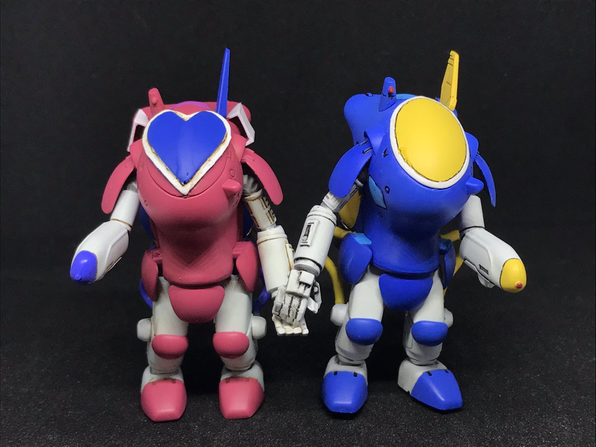 #今年作ったプラモ晒そうぜ その8&9 35ガチャーネンファイアボールSG ツインビー&ウインビーカラー ハッチ形状をちょっと変えて色を塗り分けてそれっぽく 手繋ぎショットができるよう、武器腕は2機で左右付け替えました 続