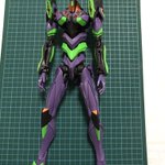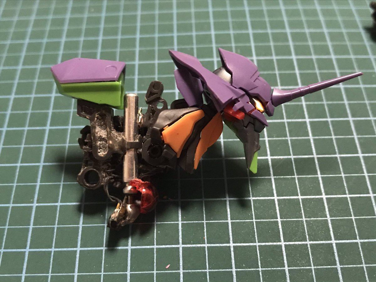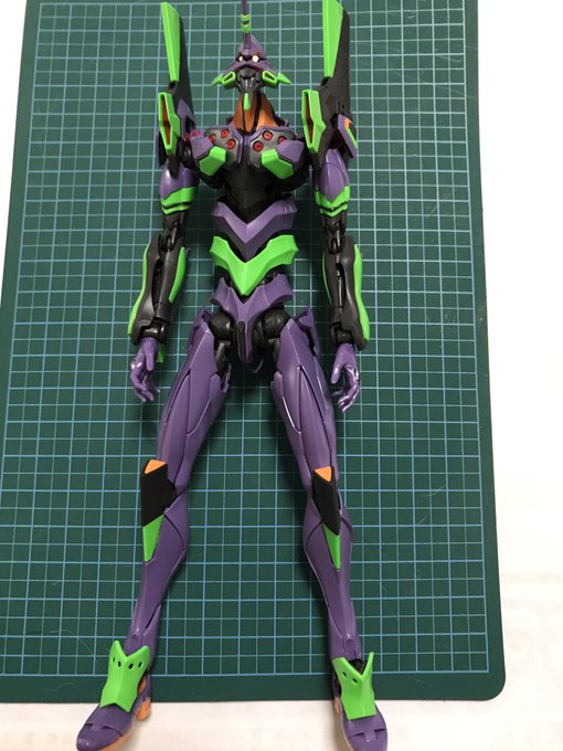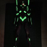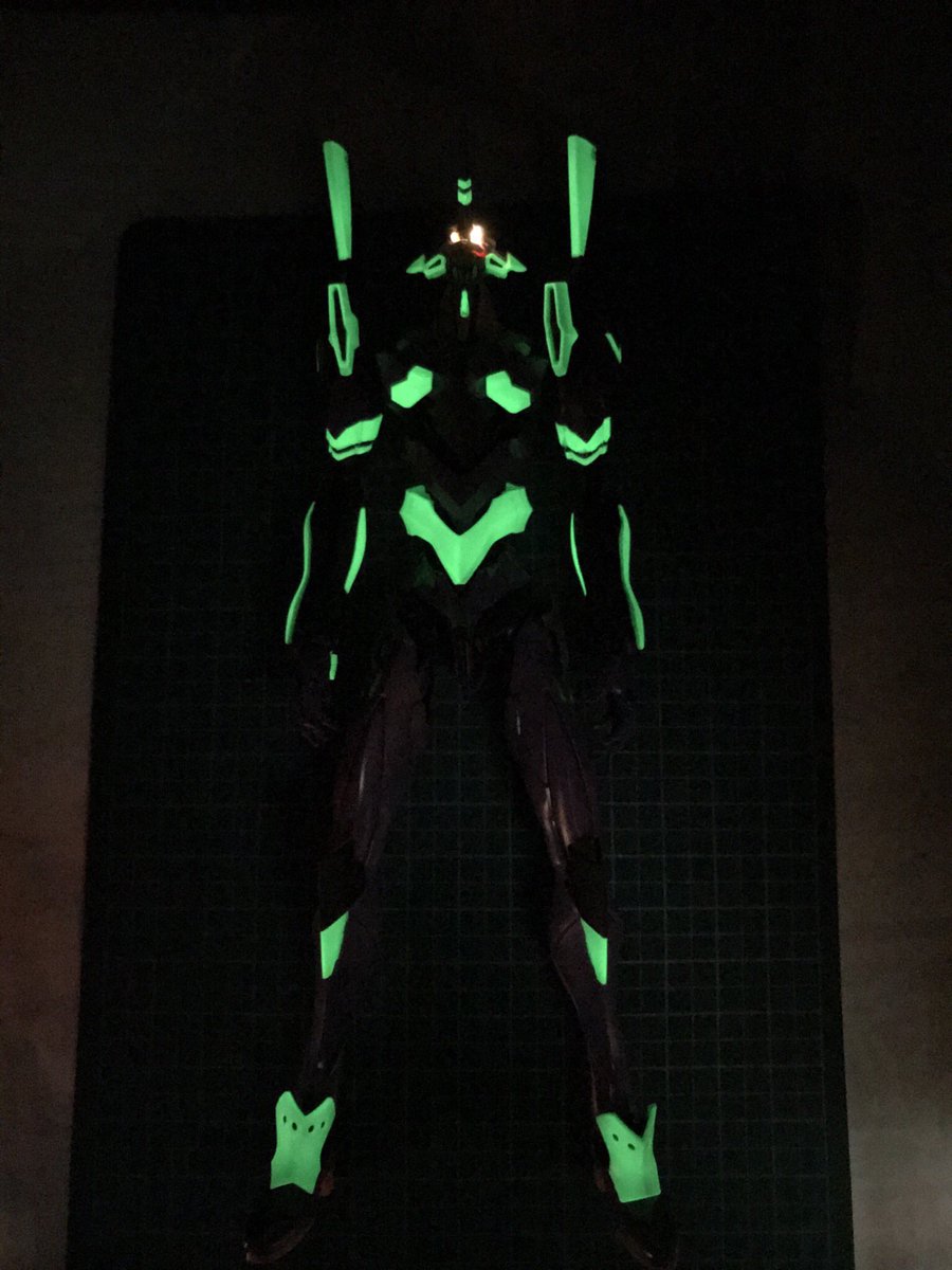 #今年作ったプラモ晒そうぜ その2 RGエヴァンゲリオン 初号機 基本素組みだけど、緑を夜光塗料で塗って、頭部にLEDを仕込んでナイトコンバット対応に アンビリカルケーブルで給電すれば楽と知りつつ、 「内部電源0、動けるはずありません!」とかってやってみたくてピン型電池を内蔵、自律発光します