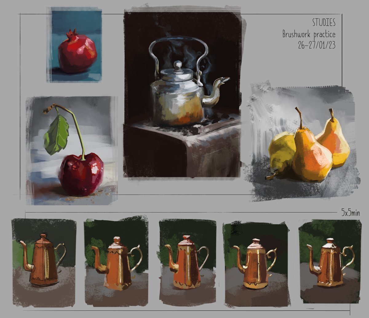 I don't post really often currently, lot of work, a lot of things that i can't show ... yet ...👀 I practiced a lot my brushwork since the beginning of 2023, here's some studies ✨✨✨ #ArtistOnTwitter #practice