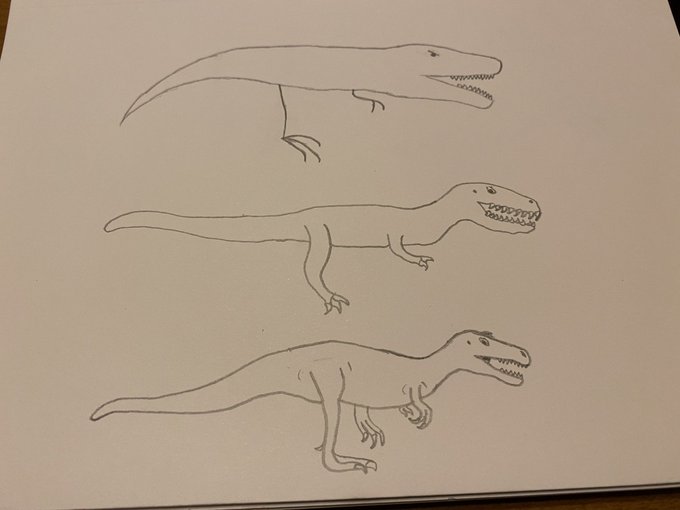 Ok, #paleoart challenge! Draw dinosaurs in the styles you used to draw them in. Then add a recent drawing or two. Here are three compressed versions progressing the years. #dinosaurs #paleontology #drawing #PrehistoricPlanet