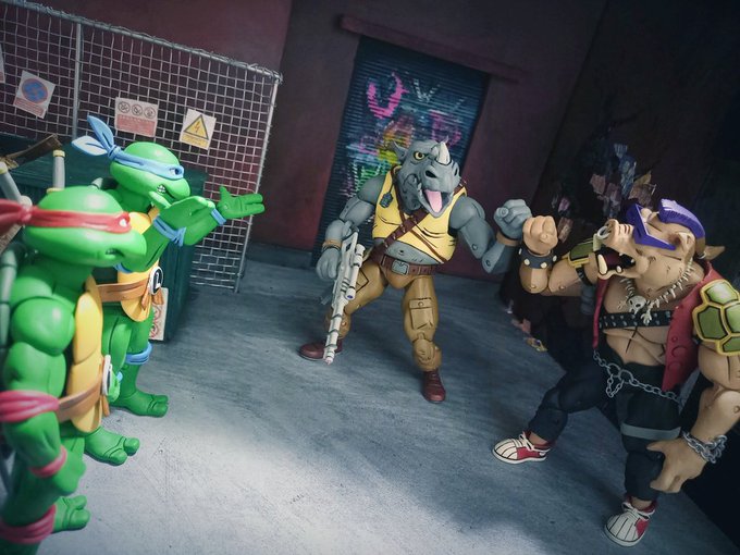 #夜のフィギュア撮影会 9月9日 お題『バトル』 愛すべきコンビバトル🆚 レオ&ラファ 🆚 ロックステディ&ビーバップ #フィギュア #ジオラマ #アメコミ #タートルズ #TMNT #neca