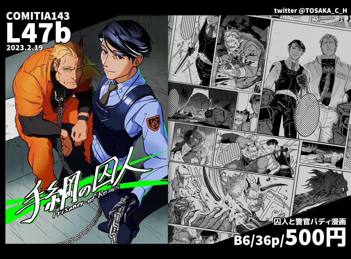 2/19 COMITIA143 東6【L47b】にて、囚人と警官のバディ漫画を頒布します。 ジャンルはサスペンス・アクション、よろしくお願いします! ※先日Twitterで本文公開したので紙で欲しい方向けになります、漫画はツリーに下げたので良ければご覧ください〜 #COMITIA143 #COMITIA143お品書き