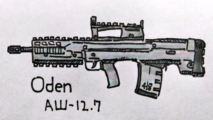 ODENアサルトライフル ーーーーー КБП АШ-12.7っていう12.7×55弾を使用した対ボディーアーマーライフル… を元ネタにもつCODのおでん。 胸やHSをいれることで2発で敵をダウンさせることができる ホントか? ーーーーー #イラスト