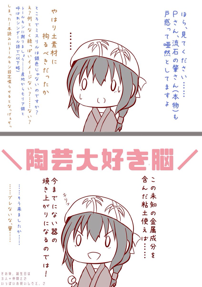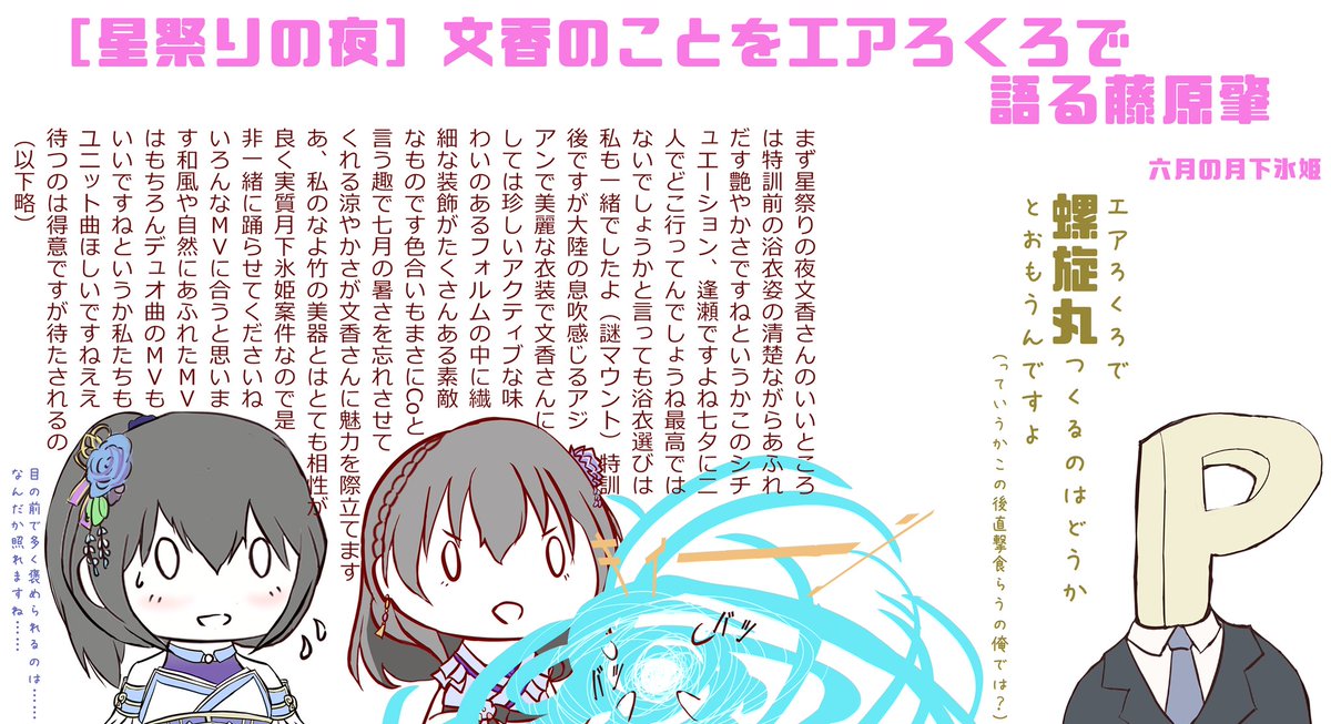 これは極まったテンションのエアろくろで[星祭りの夜]文香を語る藤原肇ちゃんのゆるい月下氷姫の図。 そんな多くの人の手元にいってほしい星祭復刻は今日の12時まで! まだワンチャンある!!かも!! #月末は月下氷姫の日