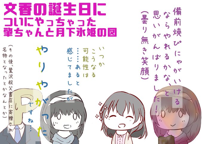 Q.目の前で誕生日会の相談するのは如何か? A.肇ちゃん&P『読書中の文香(さん)が気付くとでも???』 昼は読書の時間と夜はCG就任&誕生会がプレゼント ところでちひろさん、所属アイドル(190人)呼べる会場代は経費で(文章はここで終わっている) #鷺沢文香生誕祭2021 #鷺沢文香誕生祭2021