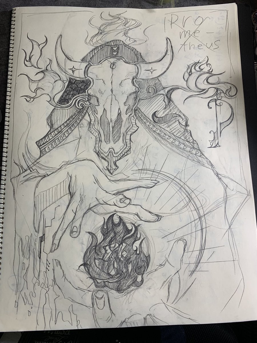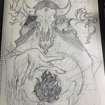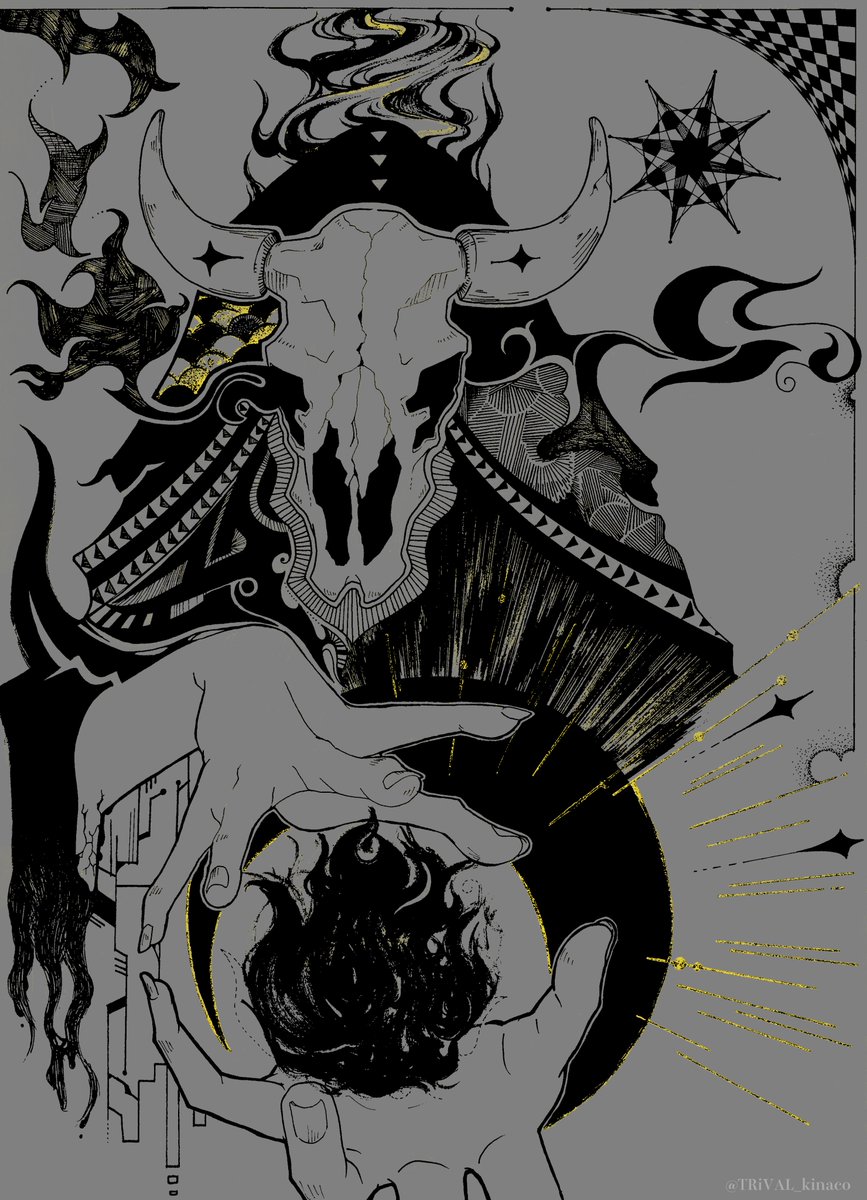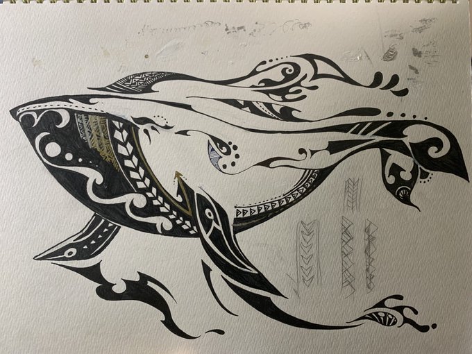 鉛筆の跡だらけだけど一通り終わったぜ 右下どうしようか悩んどる #ペン画 #牛骨 #トライバル ?笑
