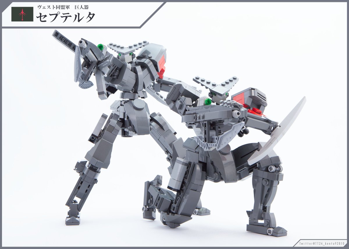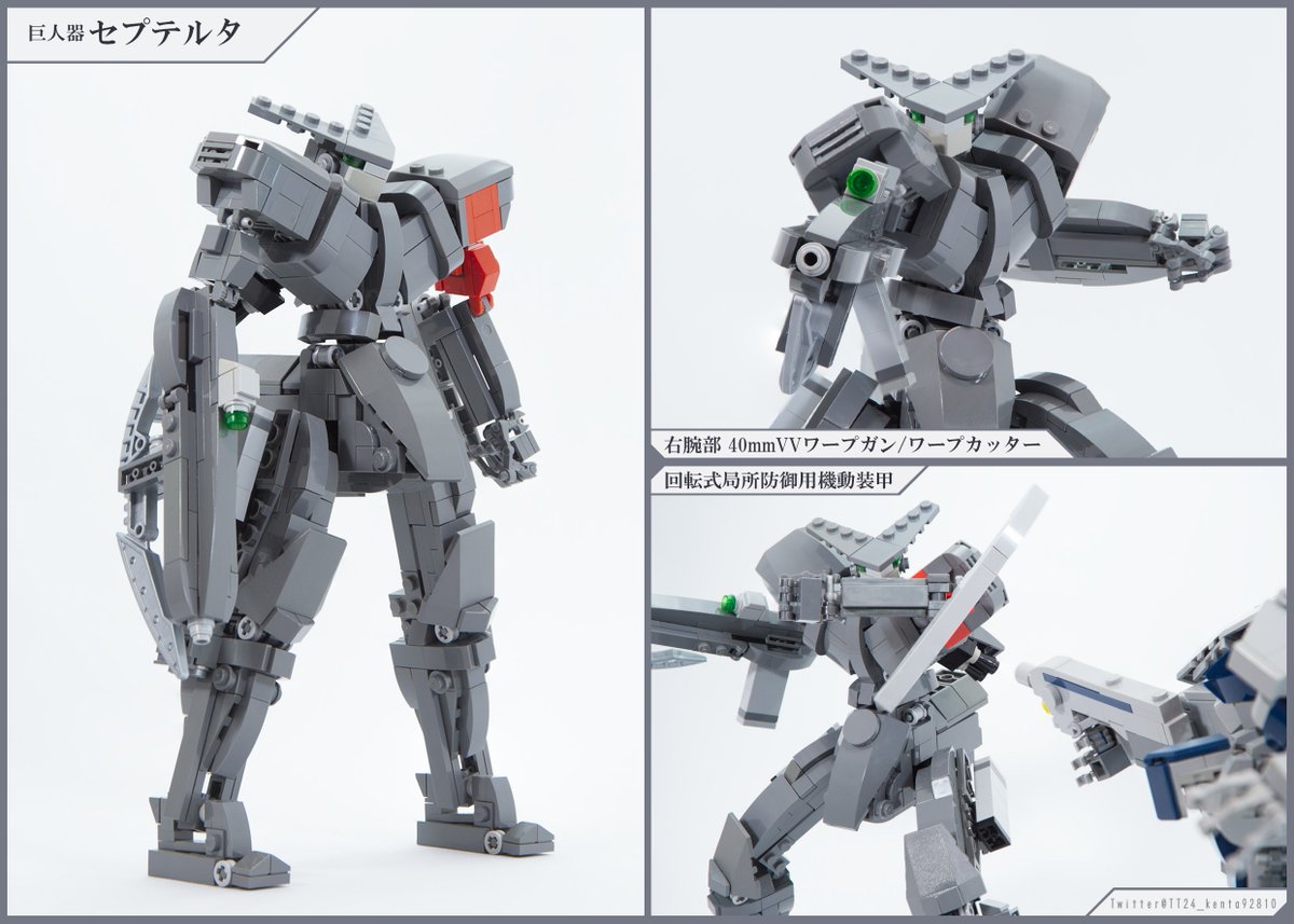 「巨人器セプテルタ」 固定武装主体で下半身に機関部とコックピットが配置された今までとは違う新作レゴロボができました 右腕部の銃は外部バレル展開と銃剣のスライドギミックがあります 量産機であるため2体制作しました 縮尺1/40、全高24cm、フィグ乗りの作品です (1/3) #LEGO #レゴロボ