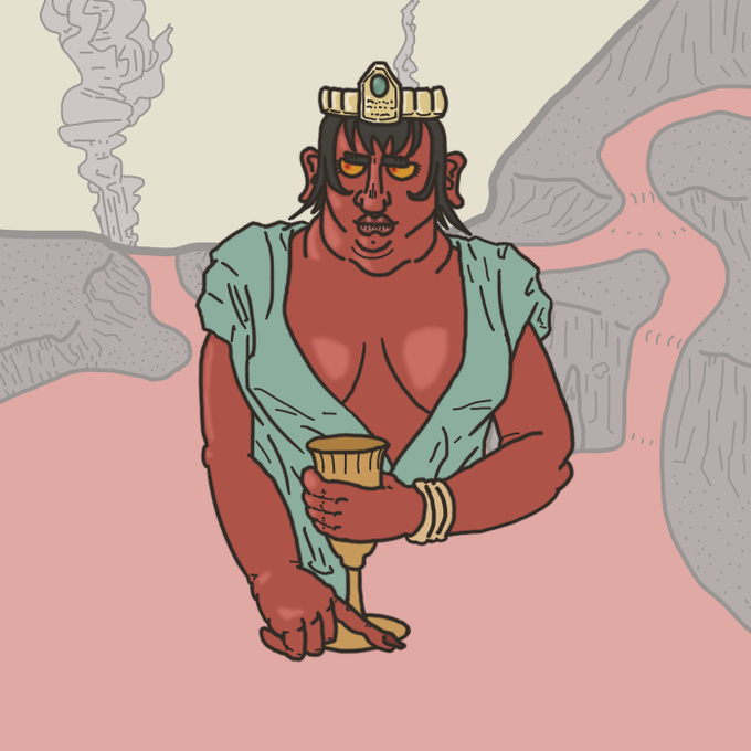 #inktober2022 Day 4 Queen Myralis the Efreeti; Likes: Loyal subjects and the finer things in life. Dislikes: Disloyal subjects and other people having the finer things in life. Wears a Helm of Telepathy and has a host of followers. #dungeonsanddragons #ttrpg #characterart #art
