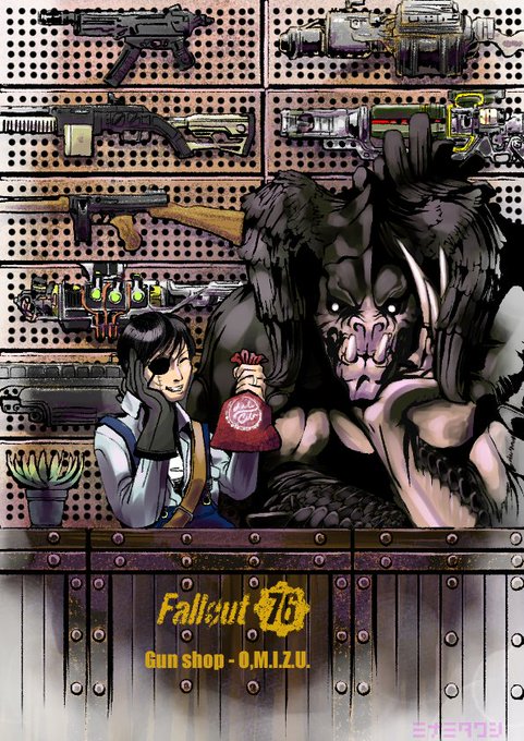 43 172 おまたせー!! @Gunshop_Omizu 「最近うわさの武器商人知ってるか?どの武器もリーズナブルな価格で、種類も豊富なんだそうだ! ……え?盗み?やめとけ、やめとけ!あの武器商人はどうやら、『ヤバいペット』を飼っているらしい。」 #Fallout76 #イラスト 23/01/15 13:30