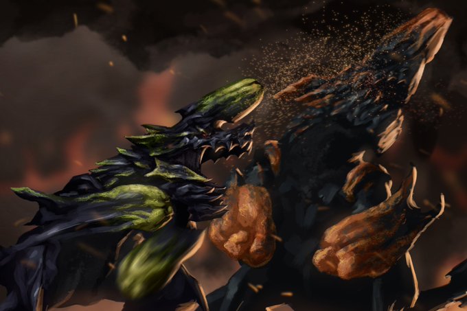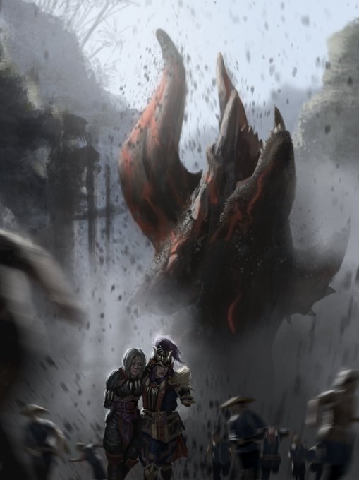 『主角の乱』 ヌシディアブロス、バゼルギウスがカムラの里を襲撃した事件。なんとか撃退には成功したが里は深刻な被害を受けたという。 ※フィクションです #モンハンライズ #イラスト #MonsterHunter