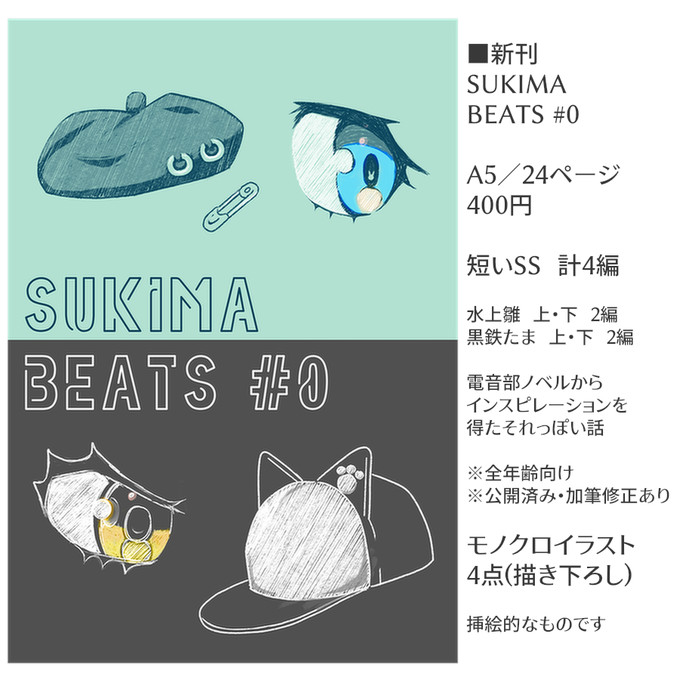 #FAIHStoFACE 初参加です。みじか~いSS4編(公開済み・加筆修正あり)+挿絵のモノクロイラストを載せた「SUKIMA BEATS #0」を頒布予定です。モノクロイラスト、まだ描いてます…
