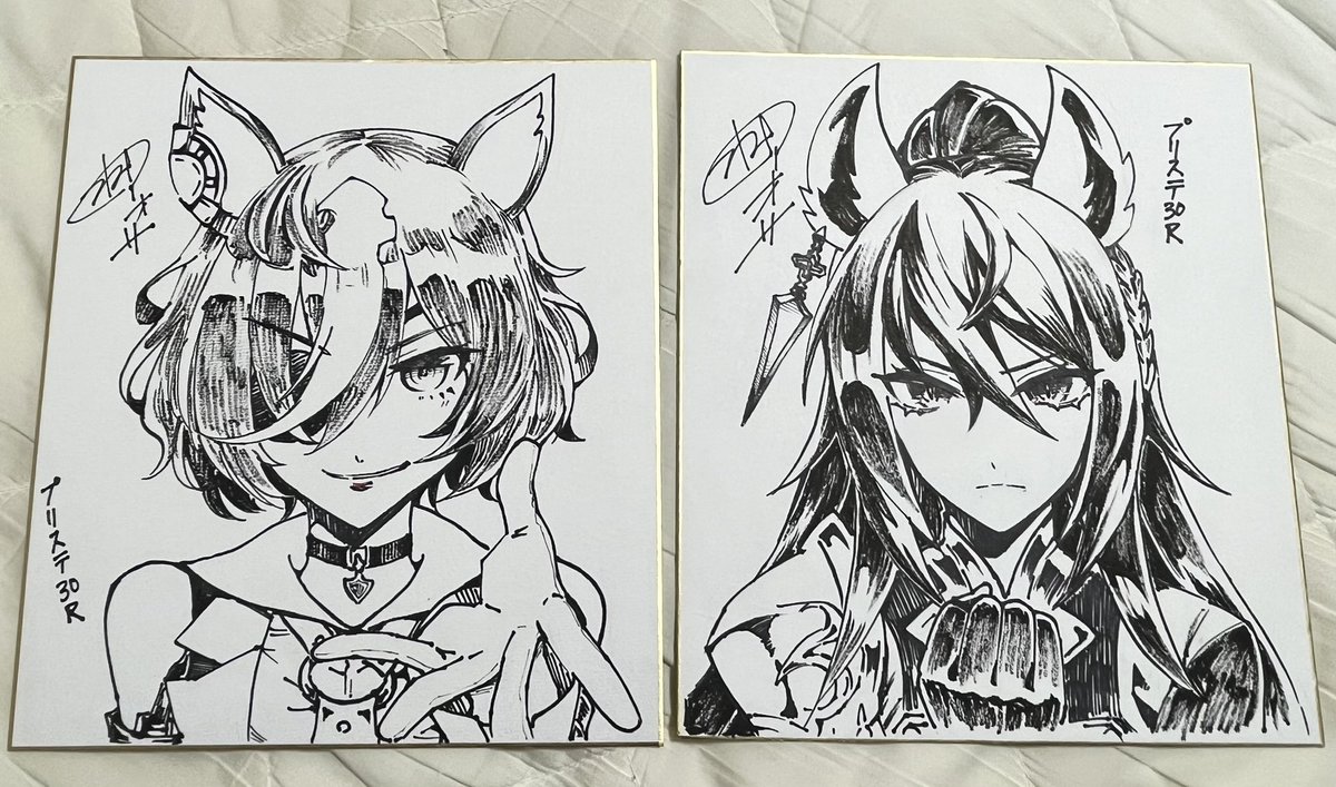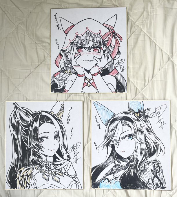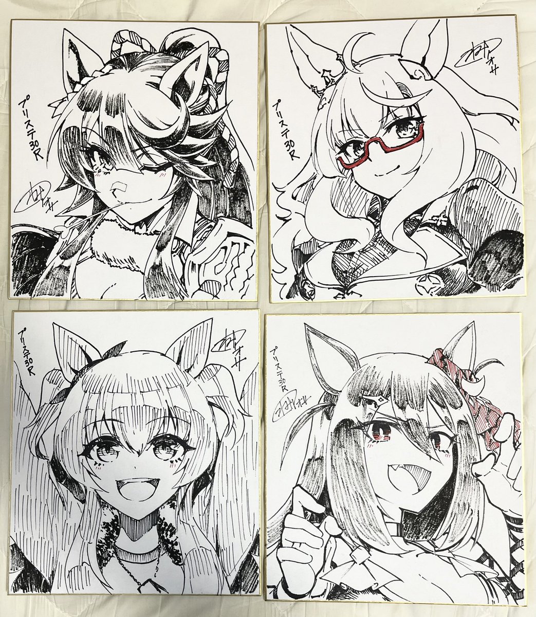 今回持ってく色紙はスティル、アルヴ、花嫁ラモーヌ、ステゴ、クロノ、ラヴズ、猫ライトオ、秋ケイエスミラクル、水着シュヴァル、エスポです 今日のプリステよろしくお願いします〜❗️ ttx.com/t_aosa/status/…