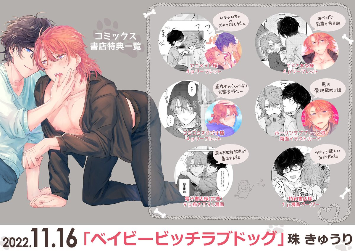 34 169 11/16発売!🐾 #ベイビービッチラブドッグ コミックス特典まとめました✨ 本編後の2人のイチャラブ生活を沢山描き下ろしてます🐶💕 ご購入の参考になれば…! #商業BL #創作BL 22/11/02 21:07