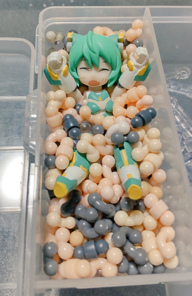 貯まった予備の間接パーツとかをバラすの面倒だなー…と思っていたんですけど、こうするとボールプールで遊んでるみたいでカワイイ🤗 作業のモチベアップ😆 シルフィーは天使😇 #デスクトップアーミー