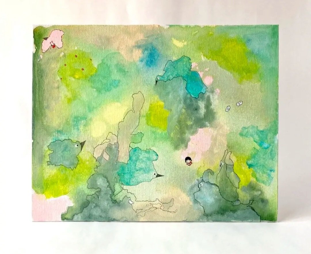 awainote @awainote1027 の絵🎨 新作です🎵 「ペポとミミ#2」 詳細と購入はこちらから👇️ minne.com/items/35212180 #awainote #minne_new #minne #原画 #絵 #イラスト #抽象画 #アート #art #abstractart #artwork #緑 #ピンク #鳥 #葉っぱ #花