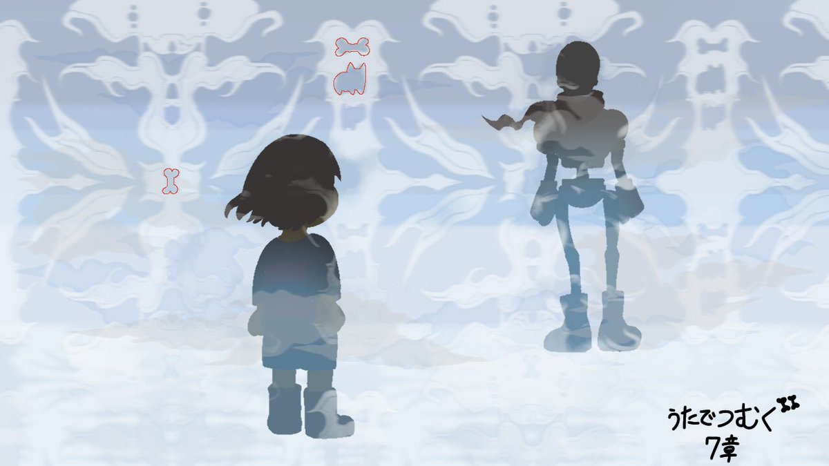 #うたでつむぐものがたり この辺描きました、多々手こずりつつ描いた記憶があります。 ゲーム画面を睨みながら霧を描いたんですけどあらぬ物がペンに詰まってしまって…(霧はアップの時にも使ってるので二枚目にも同じく何かがいます)