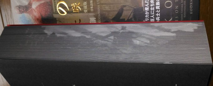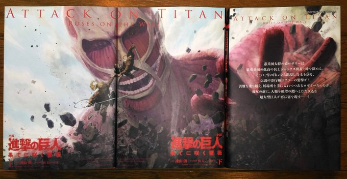 68 152 こちらは別の絵柄で描きました『進撃の巨人 果てに咲く薔薇』KC版です。愛蔵版と同内容で、ソフトカバーのいわゆるコミックスのサイズ、上下巻です。 写真は、上下の表紙と下巻の裏表紙を3冊並べて撮ってみましたが実際は上下の二冊です。 19/04/08 15:29