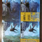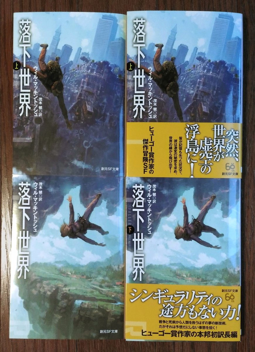 カバーイラストを描きました、『落下世界』ウイル・マッキントッシュ著、本日発売でした! サンプルを頂いたので上下に並べて写真を撮ってみました。帯が付くので書店で上下に並べていただいたとしてもつながって見えるかどうか。