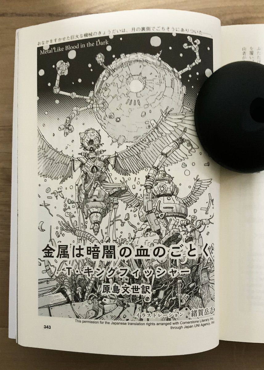 16 39 スタジオぬえ特集、そして加藤直之さんによる豪華な表紙イラストが話題のSFマガジン10月号ですが、 今回、T・キングフッィシャーの短編『金属は暗闇の血のごとく』の扉絵を描きました。 書店では売り切れているところもあるみたいですね。 22/08/27 15:03