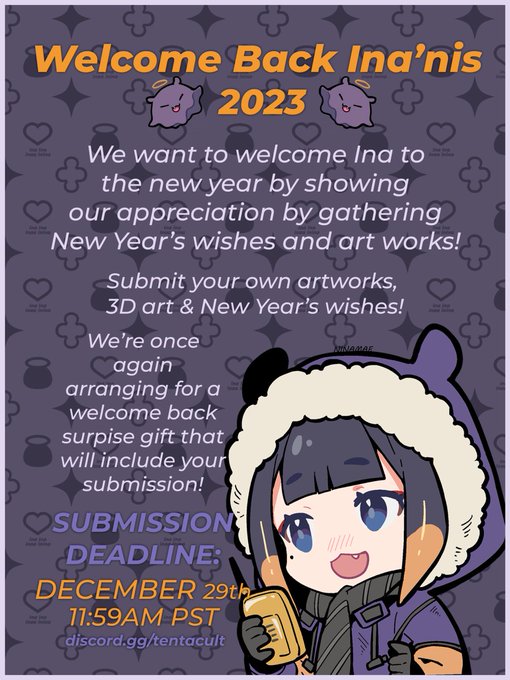 Happy Holidays Takos! In preparation and celebration for Ina's return on the 8th of January, we're organizing a New Year's Wishes Project! We will be gathering everyone's New Years wishes, artwork, and 3D art to show our appreciation! #inART #TAKOTIME forms.gle/gARz14MbmSoGTU…