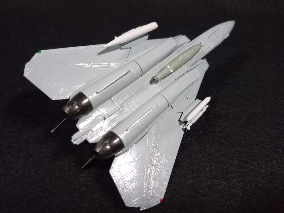F/A-14G(家入 ポポ搭乗機) ・ポポちをイメージして作った機体。弓術士=遠距離射撃担当、ということで長射程ミサイルをフル搭載。機首には矢を描いて弓術士ポイント高めに。何気に胴体パイロンの取り付けが大変だった。 ・パーソナルマークは弓矢と電撃と( ポ▽ポ)。 #ポポのアーチョ