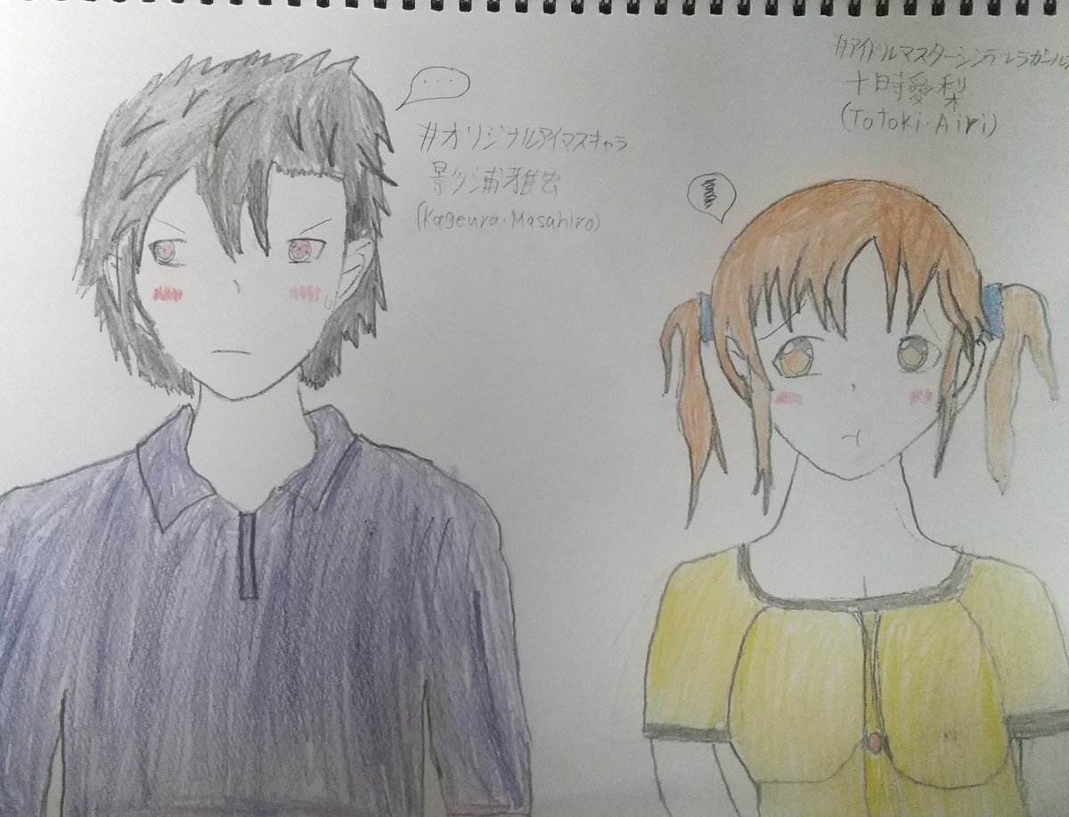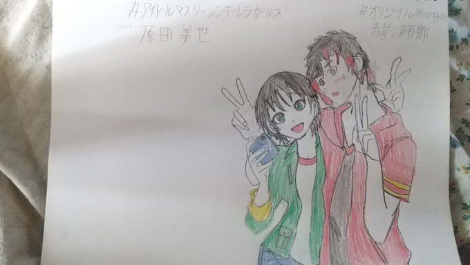 オリジナルアイマスキャラ×デレマスキャラカップリングイラスト第2弾。 今回はレーサーアイドル・赤星瀬那くんと原田美世ちゃんが自撮りでツーショットというシチュエーションで描いてみた。超ムズかった😭 #オリジナルアイマスキャラ #アイドルマスターシンデレラガールズ #原田美世