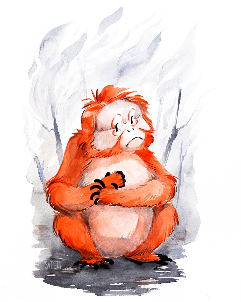 🔥Forest fires are among the biggest threats to #orangutans. Their only home is set on fire to clear the land for palm oil plantations and animal agriculture. We all could help them by avoiding palm oil and animal products in our food. #forestfires #orangutan #inktober #veganart