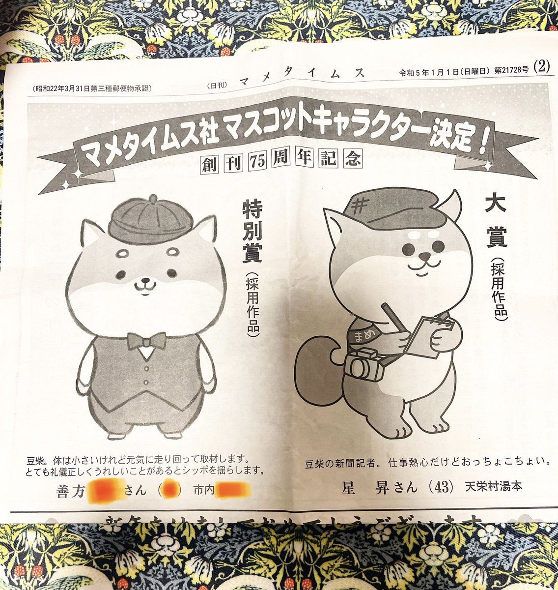 3 10 地元、福島県須賀川・岩瀬地区のローカル新聞「マメタイムス」のキャラクター募集にて特別賞いただきました🎉 (本名名義のため一部文字隠してます) 大賞のキャラクターもかわいい豆柴くんでした☺️ 普段怖い絵が多いので、可愛い系を描けて楽しかったです! #イラスト #マメタイムス 23/01/06 19:13