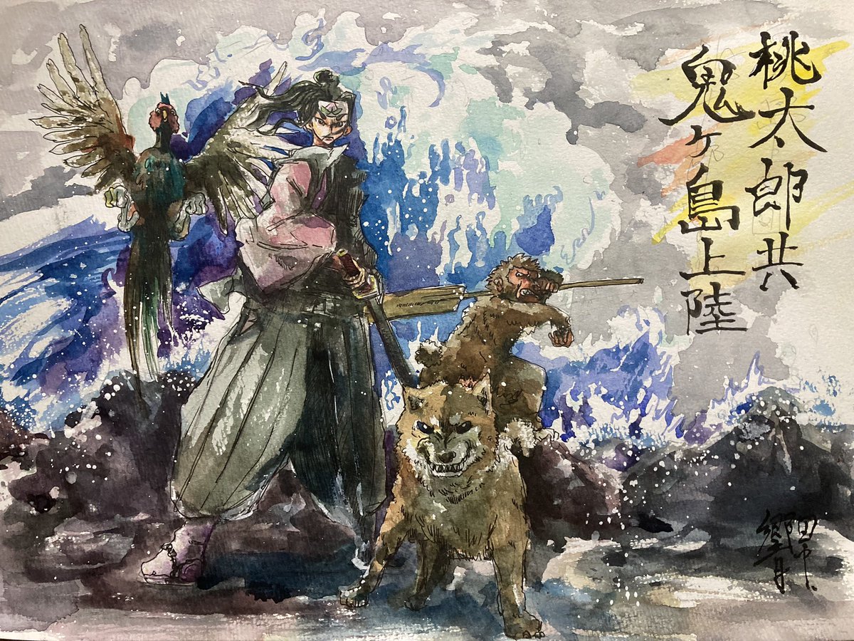 5 12 イメージボード完成 桃太郎共鬼ヶ島上陸絵図 #桃太郎 #イラスト #絵画 #水彩 #watercolorpainting #paintings #柴犬 23/04/16 15:27